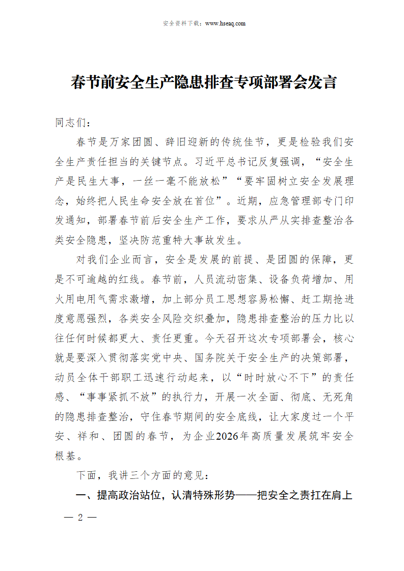 【25】春节前安全生产隐患排查专项部署会发言.docx