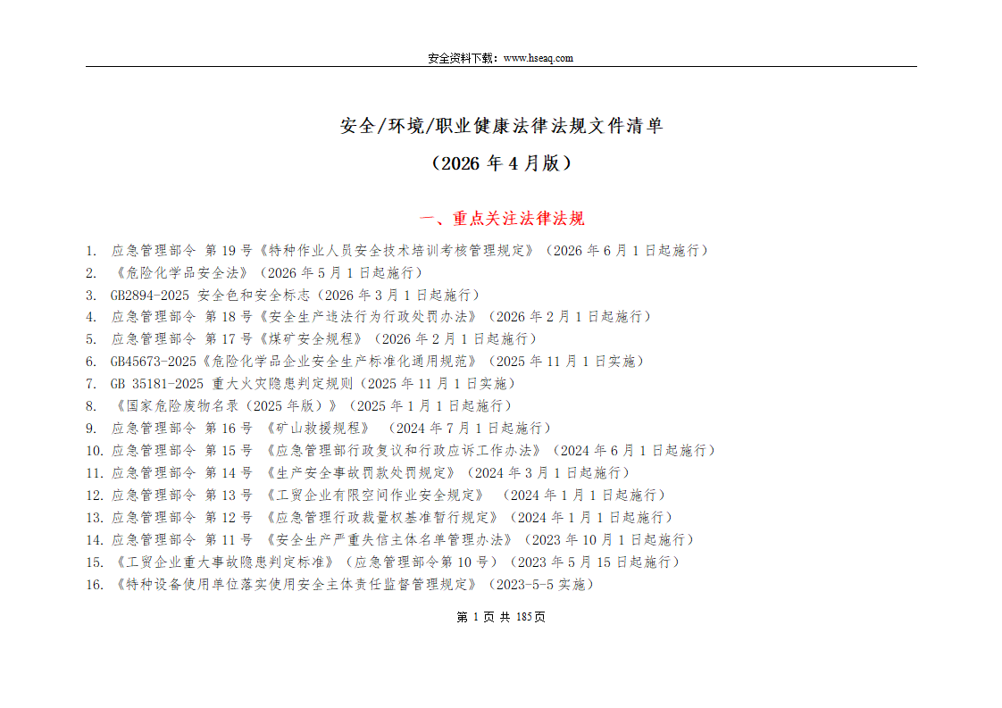 2026年4月版安全环境职业健康法律法规标准文件清单(185页).doc
